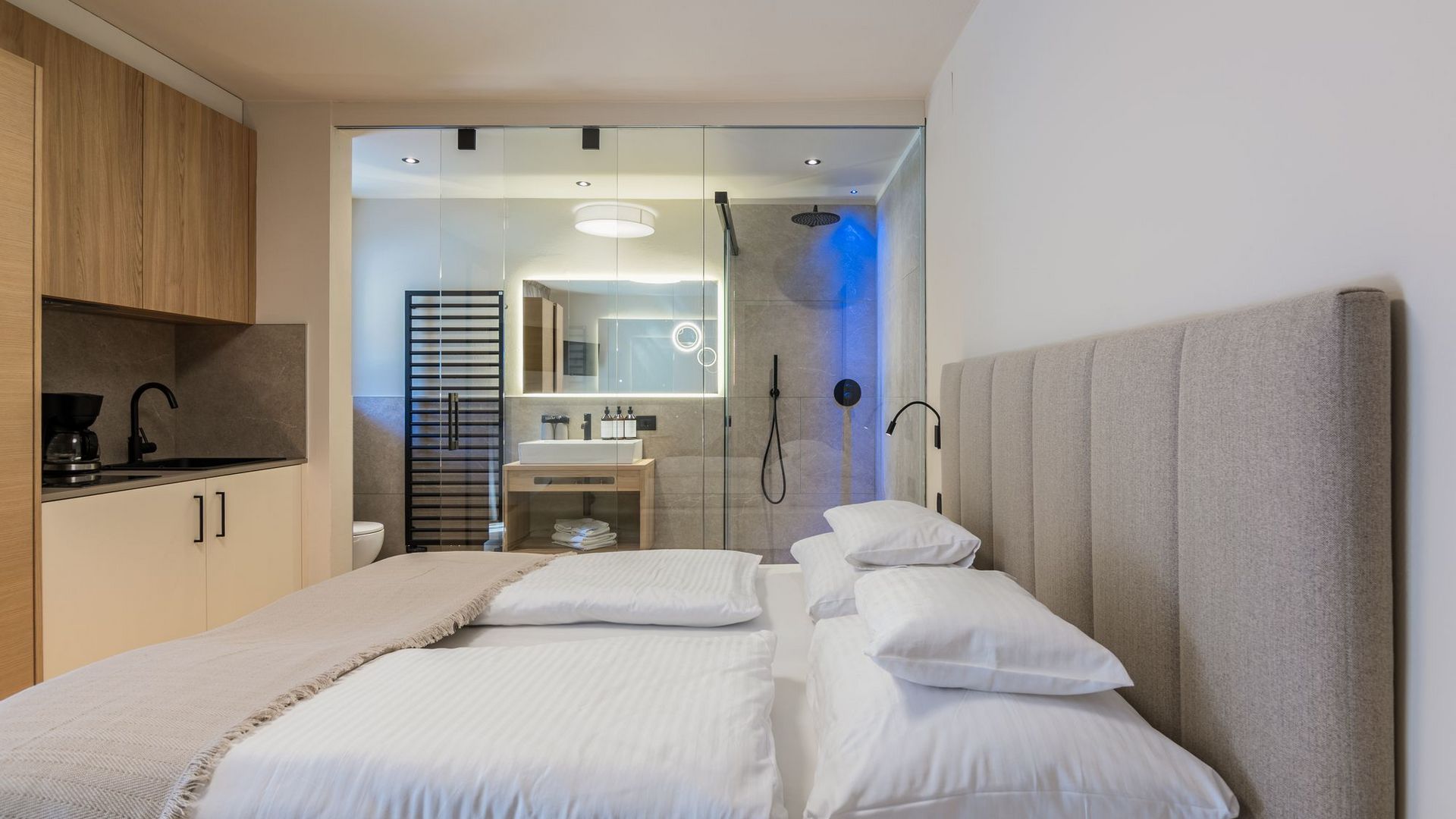 Kompakt und funktional – perfekt für eine kleine Auszeit oder als Ergänzung für Familien mit älteren Kindern. Der Wohnschlafbereich mit Doppelbett und integriertem Kochschrank bietet alles Nötige auf kleinem Raum. Das Besondere? Der Balkon zur Nordseite fängt die erste Morgensonne ein, die restliche Zeit liegt das Apartment angenehm schattig. Das moderne Bad rundet das kompakte, smarte Konzept ab und setzt auf edle Zurückhaltung und zeitlose Eleganz: satiniertes Glas für stilvolle Privatsphäre, die großzügige Walk-In-Regendusche verspricht pure Erfrischung. Ideal für Minimalisten, Paare oder als Ergänzung zu den größeren Apartments. (Hinweis: Der abgebildete Zimmertyp kann unterschiedlich ausgestattet sein, Raum- und Möblierungsunterschiede sind möglich.)